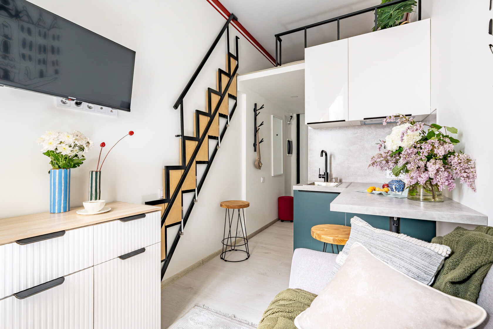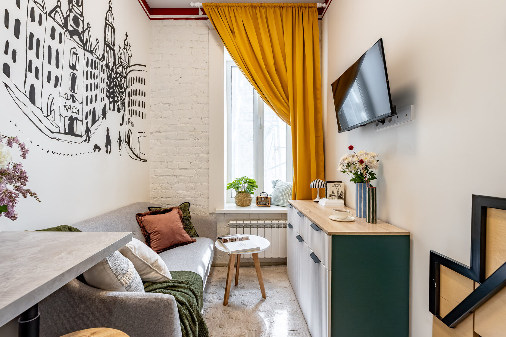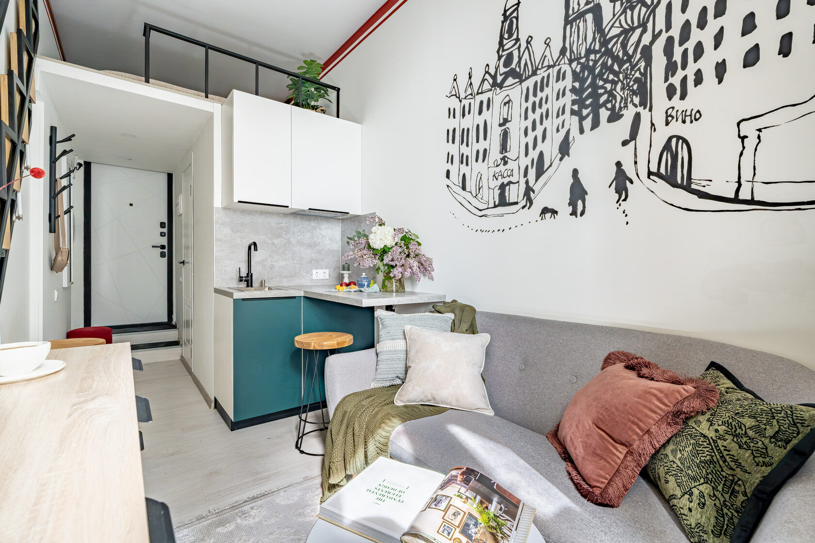 Квартира — компактная, стильная, с фреской на стене и ортопедическим матрасом на втором ярусе.