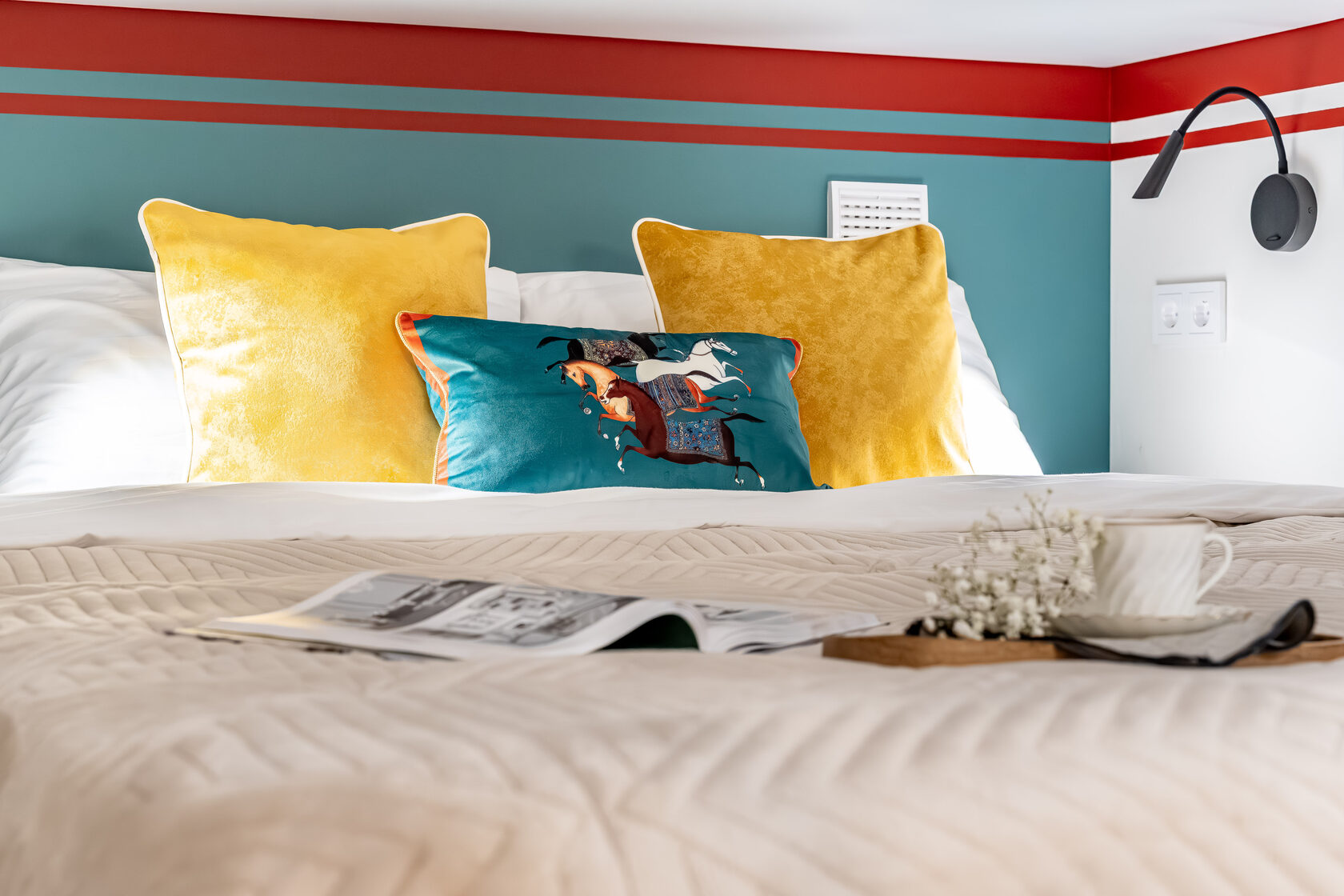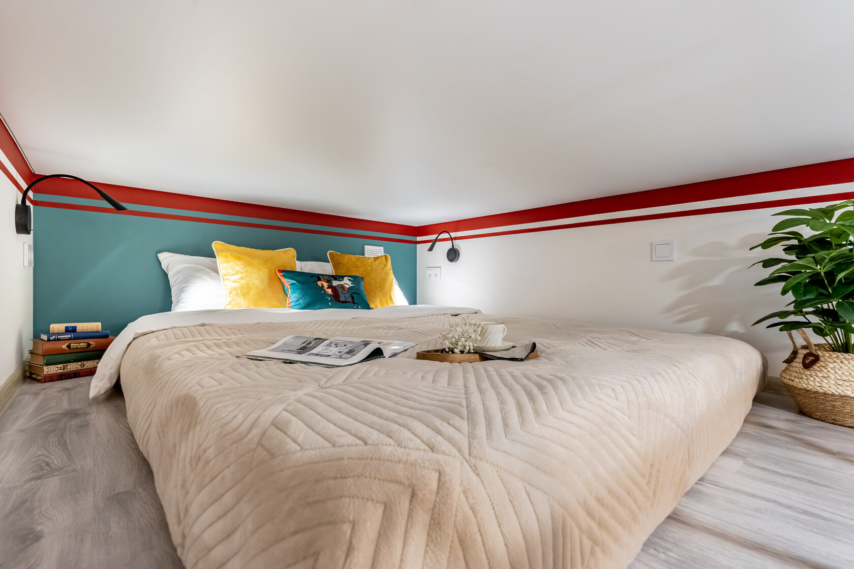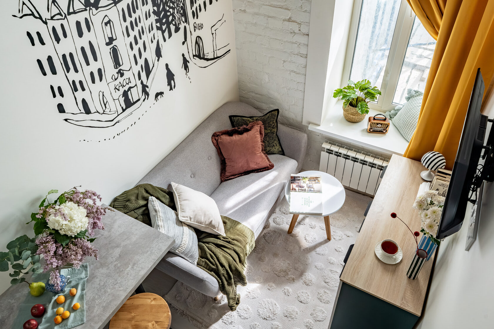 Квартира — компактная, стильная, с фреской на стене и ортопедическим матрасом на втором ярусе.
