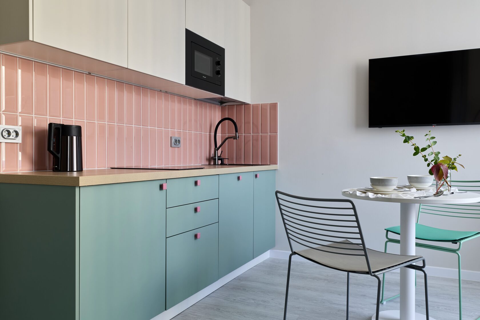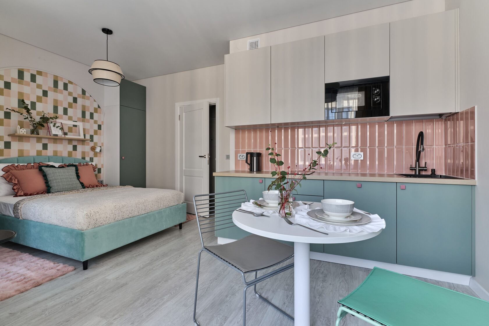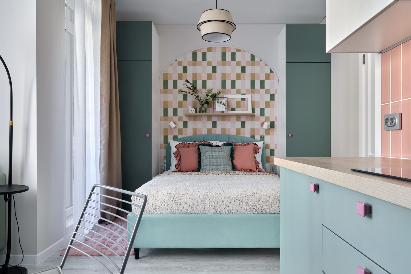 плитка цвета клубничного йогурта, мягкая кровать в мятном бархате, маленькая ваза с зеленью и чашка, будто созданная под её руки.